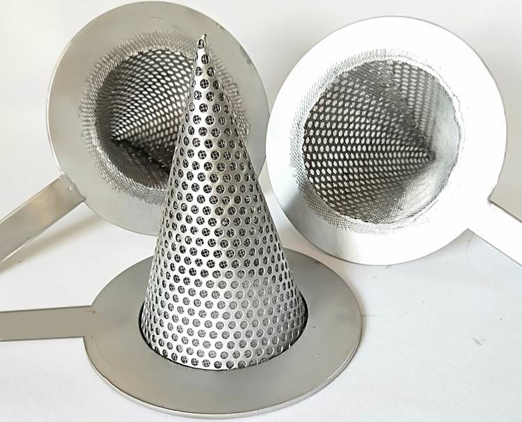 -Stainless Steel Cone Strainer made of woven wire mesh and perforated plates.